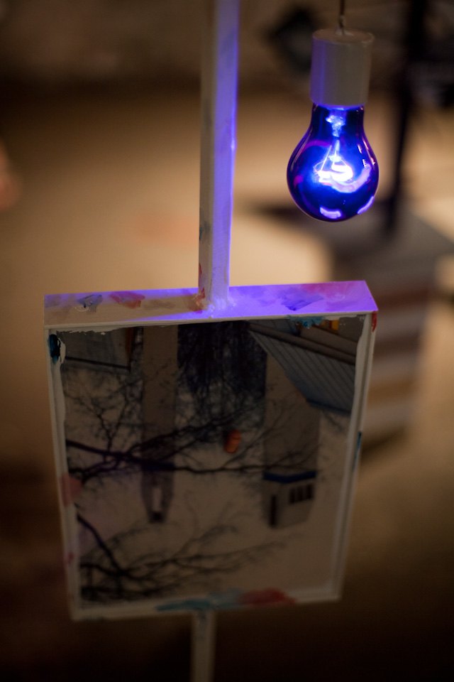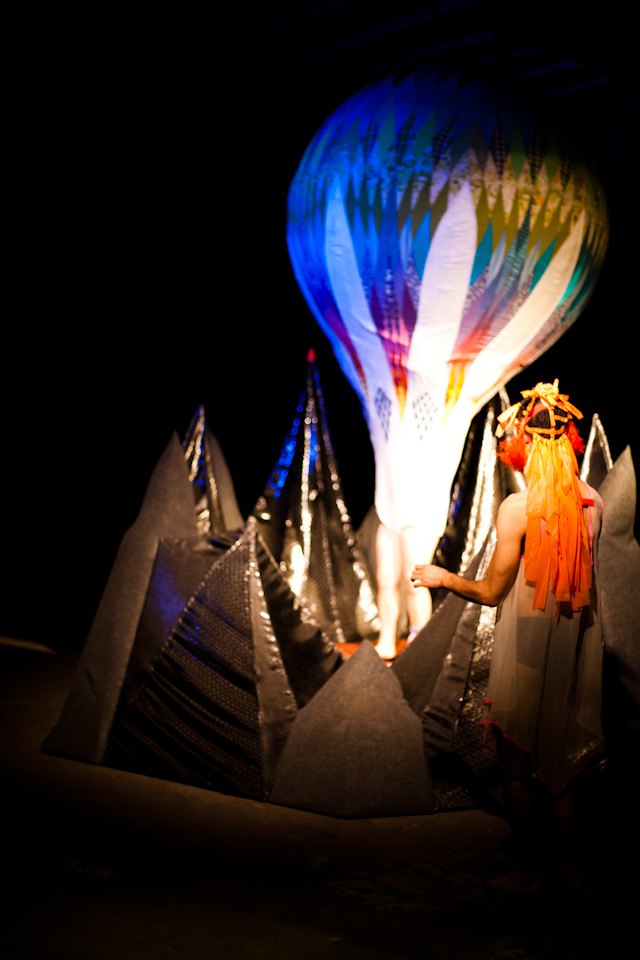 Perhaps the most striking works were presented by Leslie Rogers and  Melanie McLain. Rogers created a performative otherworldly piece in which a half man, half hot air balloon figure interacts with a mystical figure approaching and pulling away. Graced by illumination, located in the dark main room of the building, Roger’s piece will likely hypnotize and draw you in.