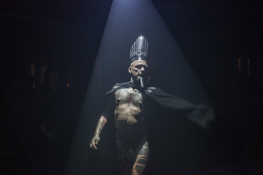 Finally, he removed the hooks from his skin, lifting himself off the steel frame for the final part of the performance. Dressed in a kingly cloak and hat, he walked in majestic, meditative circles while a recording of Jean Genet’s Our Lady of the Flowers (the French poetry novel of a drag queen who has died of tuberculosis and has been canonized) played.