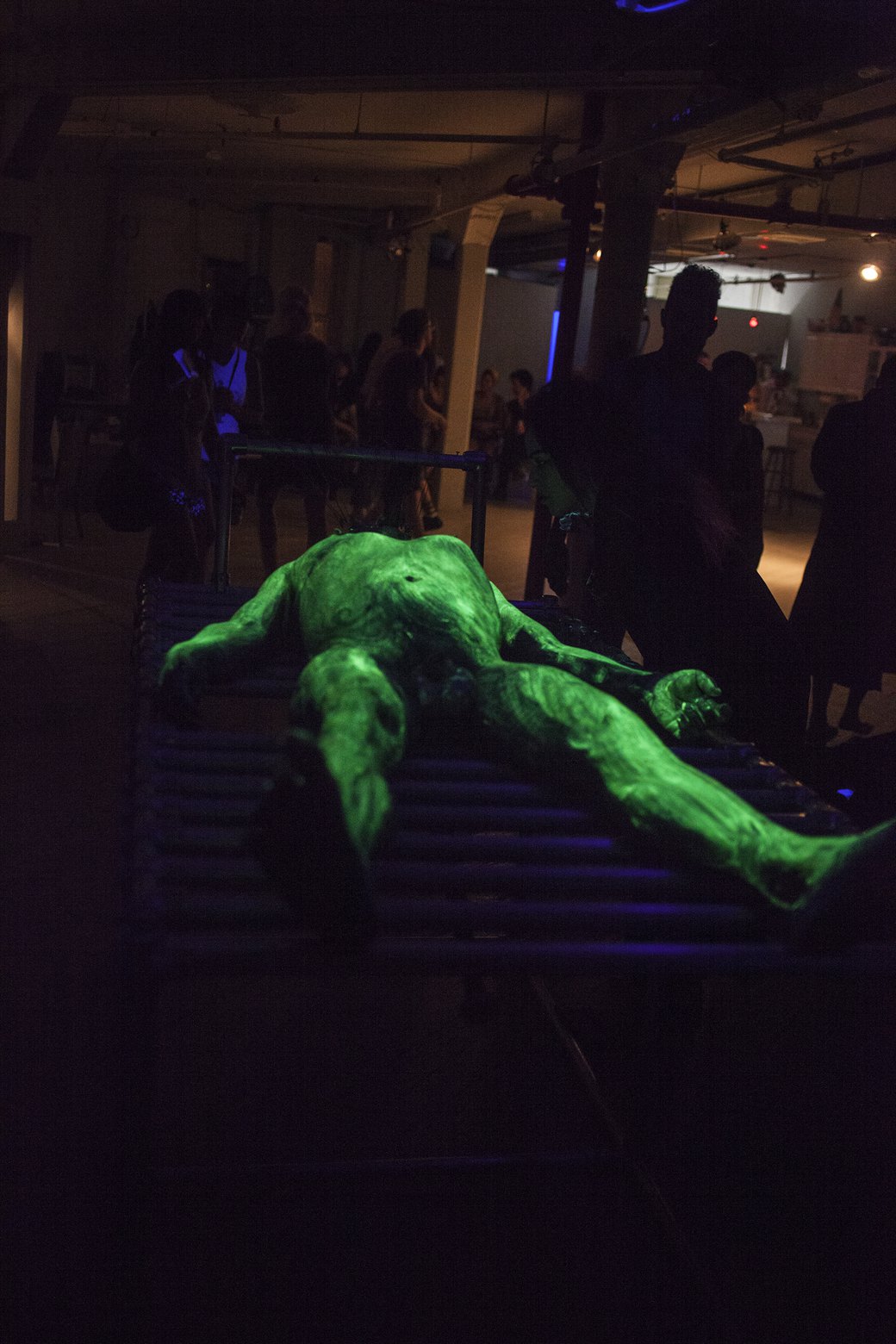The audience returned to the stifling heat indoors for the final two performances. Everyone immediately crowded around the next piece, by Ron Athey, entitled “Incorruptible Flesh: Messianic Remains.” Athey was laid out naked on a steel frame, his blue-grey eyes pulled open by fishhooks which went through his skin and cheeks. He looked at once like a hospital patient, a torture victim, a corpse on display, and a wax sculpture in a museum. The audience was eager to look at the spectacle, both curious and shy. Everyone was invited to apply a thick, glistening wax onto to his skin, wearing a glove or with bare hands. At first Athey seemed like a circus attraction, a freak show of extremity and strangeness that the audience could only ogle. The performers had requested no photography, but many pressed in closer, taking flash photographs from every angle. Speaking to curator Jill after the performance, she explained that Athey had requested no photographs because it removes the viewer from the performance, creating a distance when the performance is viewed through a lens rather than simply seen.