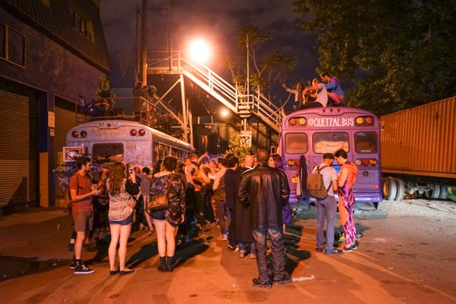 The Blue Byrds, a burning man party crew, parked two busses side by side in an industrial zone for an all-night dance party which included a DJ spinning atop the bus!