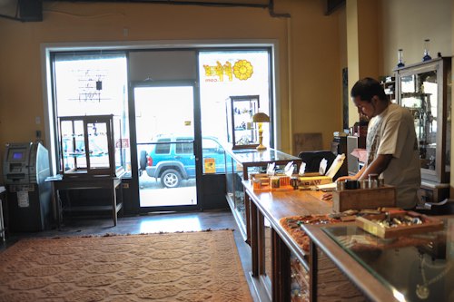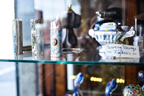 Sunflower Glass Company opened in December 2012, and has been amping up its sales since then. When we visited them on a Sunday afternoon, the shop was hopping with a colorful clientele. A great addition to the physical store is a fully functional, well-stocked online shop. It seems that Sunflower Glass Company takes their craft pretty seriously. Their mission reads: “Sunflower Pipes is dedicated to the experience of smoking. We highly regard the act as an art and a ritual, and in doing so we take extra special care in choosing the products for our line.” They feature a number of beautiful glass pieces and some gorgeous vintage lighters (above and below).
