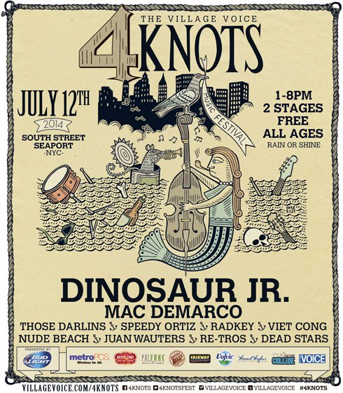 Last year’s 4Knots lineup was pretty rad– Kurt Vile, Parquet Courts, White Lung, Marnie Stern, and more graced the sweltering stage– but this year’s a real doozy. Headlining the free, all-day affair is Dinosaur Jr, right alongside everyone’s favorite weirdo songwriter, Mac DeMarco.