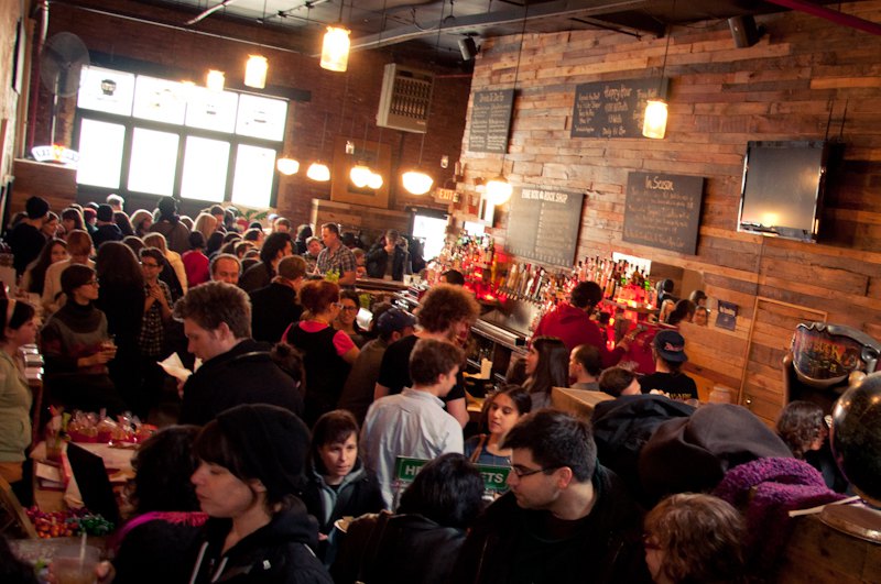 Housed behind the fluted glass windows of an inconspicuous Flushing Ave storefront, The Narrows, an antidote from Bushwick dive bars, is reminiscent of a 1950s lounge, with a sleek, art deco design and appropriately dim lighting. Toast the Mad Men in your life with a selection from their list of draft beers, international wines and handcrafted cocktails with ingenious names like Babushka , a vodka-ginger-based libation ($8). Living up to its name, the narrow interior is dominated by a burnished metal bar, juxtaposed with tucked away booths you can easily imagine the Rat Pack idly lounging in while ordering stiff martinis. Dim, moody lighting completes the ’50s throwback vibe and a heated, wood-planked backyard deck lets you drink in the great outdoors year-round. They recently started offering dinner service and shellfish connoisseurs will be pleased to know they offer $1 oysters everyday ‘til 7pm. Cash only.